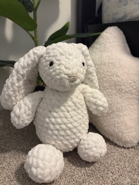 The Snuggle Bunny Friend is an extra-soft, cuddly plushie made for hugs and comfort. Each bunny is handmade by me with love, making every piece one-of-a-kind. A perfect companion for kids, bunny lovers, or anyone who loves cozy handmade plushies.